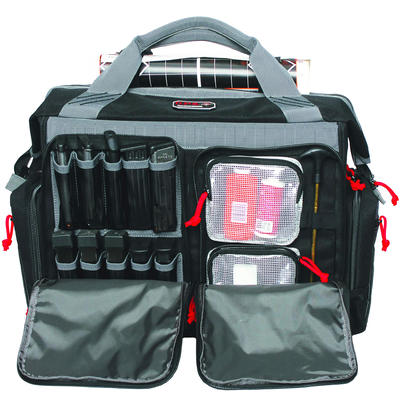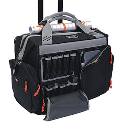 This bag features oversized ATV wheels and a wide mouth top opening and a telescoping handle for easy transport. All components of this storage system including storage pockets for eye and ear protection, targets, stapler, tape, binos, tools, cleaning supplies, extra magazines, and an innovative fold out vertical handgun holder. This handgun holder allows the shooter to store two medium or small frame handguns inside the bag in a secure vertical storage format that allows better organization at the range. They constructed this Rolling Range bag with the same strong materials used in making better grade luggage. A rigid internal frame with 6 metal rivets ensure it's long term durability.